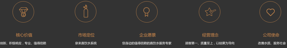公司始終堅持“改善水質,服務社會”的企業使命,奉行“創新、積極響應,專業、值得信賴”的核心價值觀,以用戶需求為導向,注重新產品研發與品質控制。泉來所銷售的產品均獲得衛生部衛生批件和檢測報告,品質標準均參照美國NSF標準執行,其品質深受消費者的信賴和業界認可。